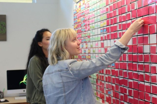 Emma Goad, Editor-in-Chief of Hoof Prints works on the post it wall in the yearbook room. The wall helped Yearbook Editors keep organized and meet deadlines during production of the 2017 book.