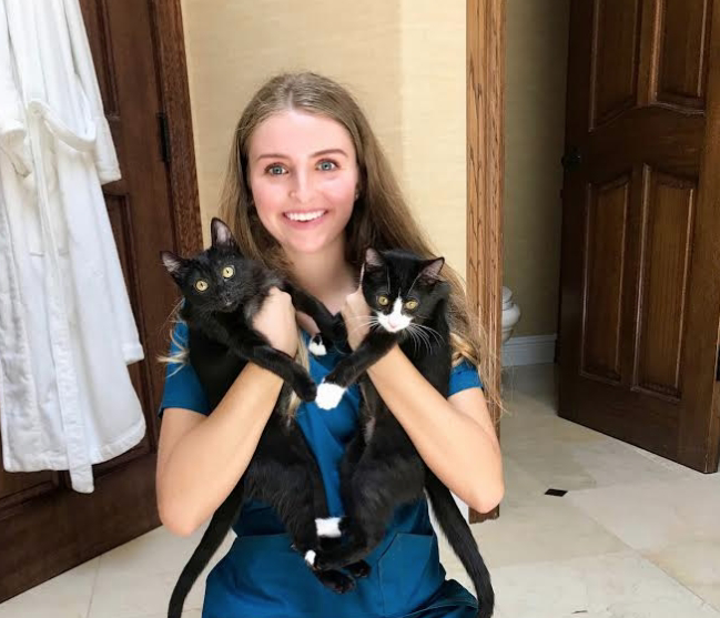 DOUBLE TROUBLE: Junior Jessica Bruhns smiles with two foster kittens. Bruhns has been fostering kittens and puppies from the Hawthorne spcLA shelter for the past eight years and works with different veterinarians to gain experience in the field. Photo Courtesy of Jessica Bruhns