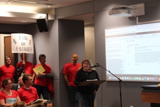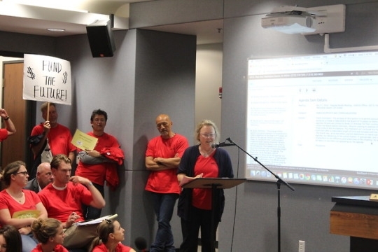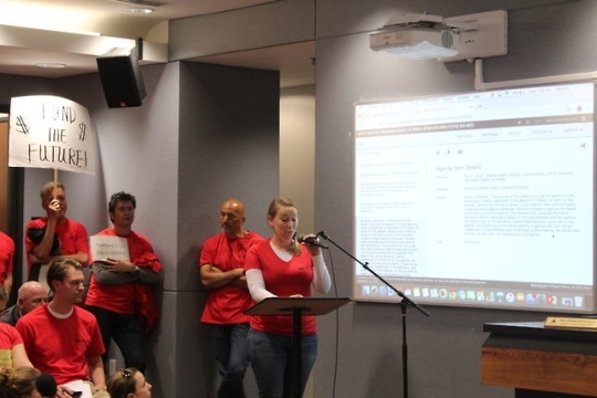 Lisa Mittleman, mom of Costa student, spoke as the first parent. She addresses the problem of students not getting the proper teaching they need when teachers leave on maternity leave.