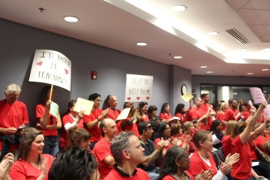 Teachers put up signs and posters during Ms. Chen’s speech. They clap along as they support her.
