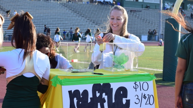 A Mira Costa mom is selling raffle tickets to those at the tailgate party before the football game on Friday. Volunteers, or Costa parents sold raffle tickets for $10 each or three for $20.