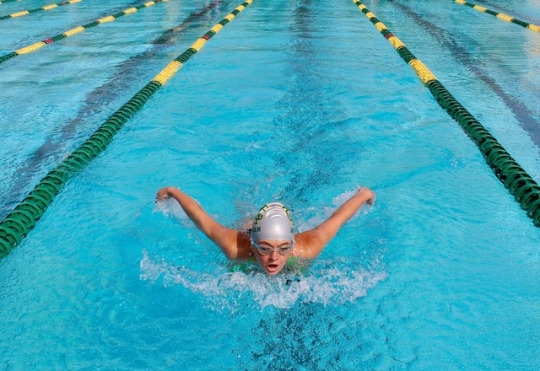 Costa girls varsity swimmer is projecting herself towards the end of the pool by using the butterfly stroke. She finished first in her heat.