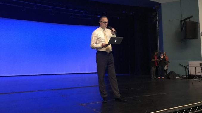 Principal Ben Dale rehearses his speech in the auditorium during lunch in preparation for the Black History Month assembly. The assembly will be held during second period tomorrow on Valentine’s day.