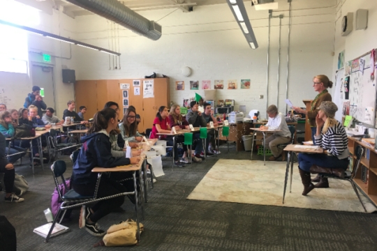 Mira Costa students compete in Scholar Quiz inside room 102 during the lunch period. The host of the quiz is supposed to read out a question and which ever team raises their flag up first has the opportunity to answer the question and score points for their team.