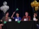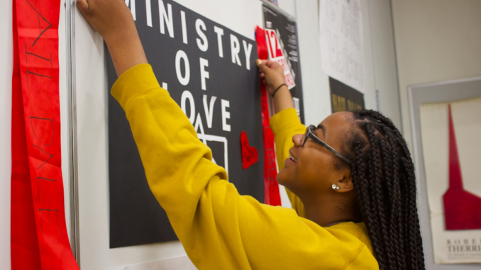 Senior Hailee Burns assists English teacher Shannon Vaughan in hanging posters around her classroom for her sophomore class. English 10 is reading the book 1984, and the posters are up to help students immerse themselves in the world of the novel.