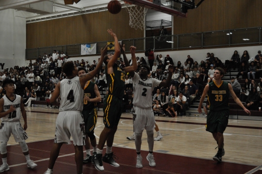 Senior Cameron Steen shoots the ball during the second quarter of their game against Torrance High School. The Mira Costa High School boys basketball team played Torrance High School on December 13th at Torrance High School.Senior Jackson Weaver shoots the ball from the 3 point line. The Mira Costa High School boys basketball team shirted the ball around the court until Weaver was open to shoot. Senior Cameron Steen shoots the ball after dribbling towards the basket. After seeing the open space, Steen was able to drive towards the basket, scoring 2 points for the Mustangs. Junior Bobby Barkley dribbles the ball down the court. Since Torrance lost possession of the ball, the Mustangs were able to switch to offense, in attempts of scoring a basket.Senior Brandon Chan shoots the ball in the 4th quarter of the game. Chan was able to shoot the ball even though he was being guarded by a Torrance player.