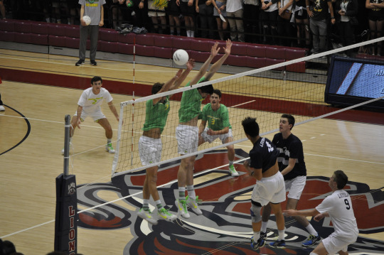 Setter Rob Mullahey (left) sets the balls to middle Jack Tolt (right) in Mira Costa’s match against Loyola High School. Senior Roy McFarland hits the ball over the net after being set by Senior Rob Mullahey. Mira Costa boys volleyball teammates come together to block the player hitting on Loyola. The Mira Costa student sections loudly cheers shortly after the Costa boys volleyball team wins their match against Loyola. Senior John Conde prepares himself to pass the ball Loyola served to him.