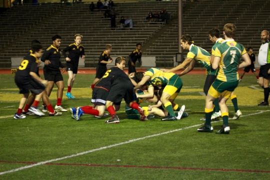 Players rush to help their teammate keep possession of the ball.