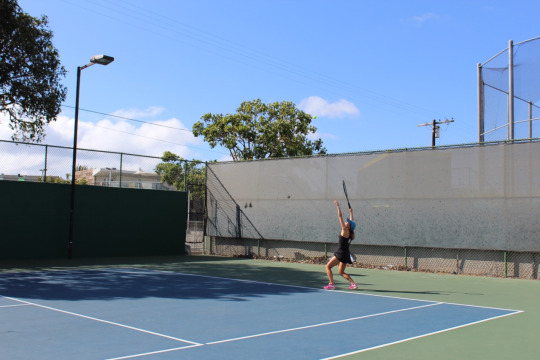 Senior varsity player Amy Gaal prepares for her serve against West Torrance.Freshman varsity player Audrey Vo charges the net and wins the point for her team.Senior varsity player Lena Nagy prepares in ready position for the opposing team’s serve.Sophomore varsity player Lindsay Giese tosses the ball up for her serve.Senior varsity players Isabella Draskovic and Katrina Draskovic warm up together before their match.