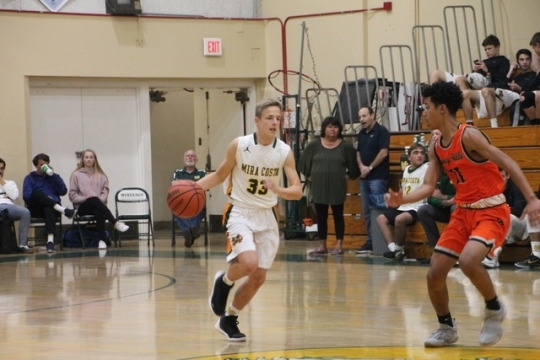 Tommy Waller, a great defensive player is dribbling down trying to find an outlet to pass to. Tommy played for half the game and made some great passes.