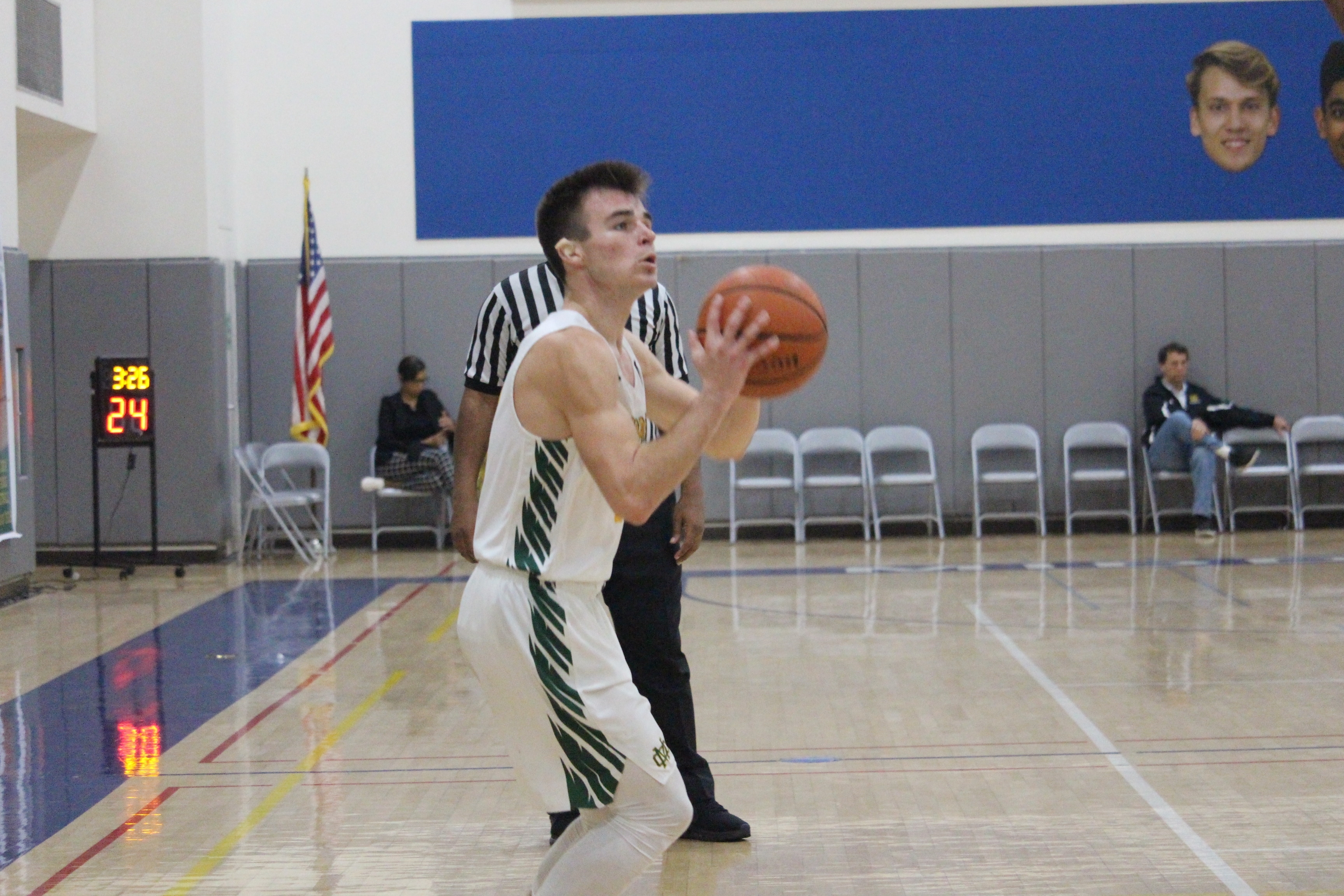 IMG_7423-1 Senior Carson Carey shooting a three pointer. Mira Costa boys basketball beat Centennial 63-28. Photo By: Jade Trejo