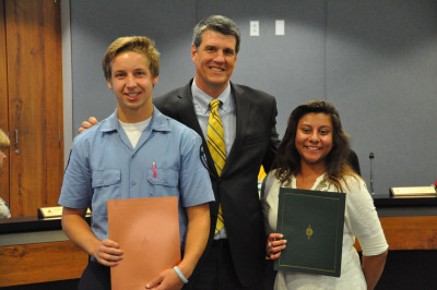 (top left) Dr. Matthews awards two SCROC students for their excellence in the program. (top right) Lisa Tanita accepts her award for Teacher of the Year. (middle) Seven MBUSD teachers accept their awards for Recognition of Teacher of the Year (bottom left) ASB students listen in on the MBUSD meeting. (bottom right) MBUSD Computer Science Teacher advocates the importance of Computer Science in society.
