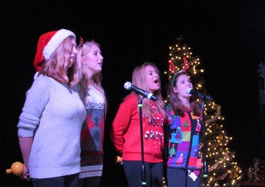 Mira Costa Junior Charlie Lusky performs her solo during a quartet performance at the Drama Benefit Show on Tuesday night. The quartet sang a modern renditions of many Christmas classics.Kavita Sarathy recites a powerful remembrance speech she wrote for the Drama Benefit Show concerning the importance and memories of the holidays. The Drama Benefit Show fostered many poems by the students.Mira Costa Senior, Julia LeVee, sings holiday songs during a duet to raise money for the Drama program. Many duets were sang at the show to raise Holiday spirits and Drama funds.Mira Costa Sophomore Stephanie Sala performs a comedy skit to start off the Drama Benefit show. Many students acted and performed stand up comedy, instead of solely singing.The Drama Department Leadership welcomes the audience to the Drama Benefit Show and details the importance of the fundraiser. The Drama Department Presidents helped organize the event.
