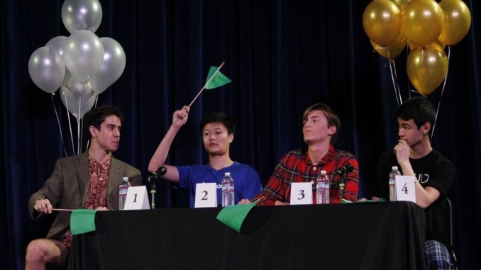 Junior Kevin Chen raises his flag to answer a question for the green team for the scholar quiz finals in the auditorium during second period. The green team defeated the white team and the match resulted with the score 210-105.