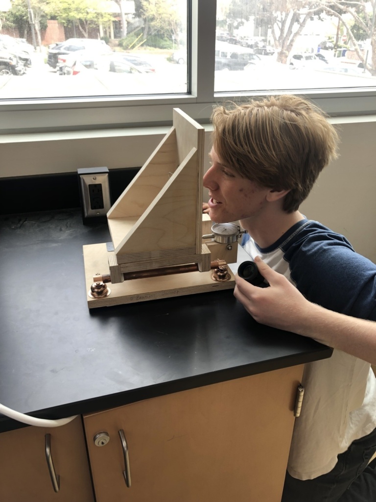 Senior Mason Kidd taking measurements on his telescope which is his final project for astrophysics. He found the the radius of curvature of the telescope lens so that he could calculate its focal length