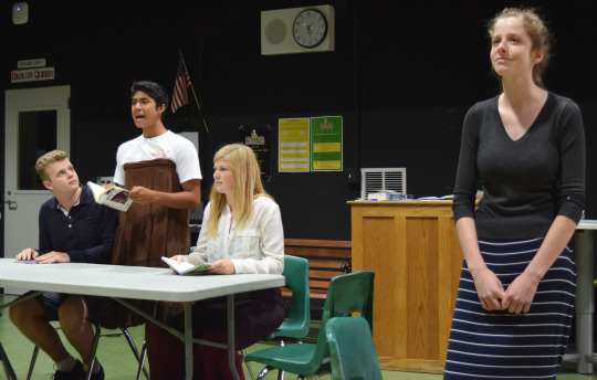 Drama students (from left to right) Jack Drinker, Toby Kamish, Katie Cochran, and Claire Layden preform an original scene on Tuesday in the drama room for their class. Their seen, “Return of Eed” sent roars of laughter throughout the audience.