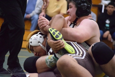 With the team score tied 33-33, Varsity Heavy-weight Joe Gebele puts in a half nelson, however his opponent got a reversal and took the win for the Warriors late in the third period.