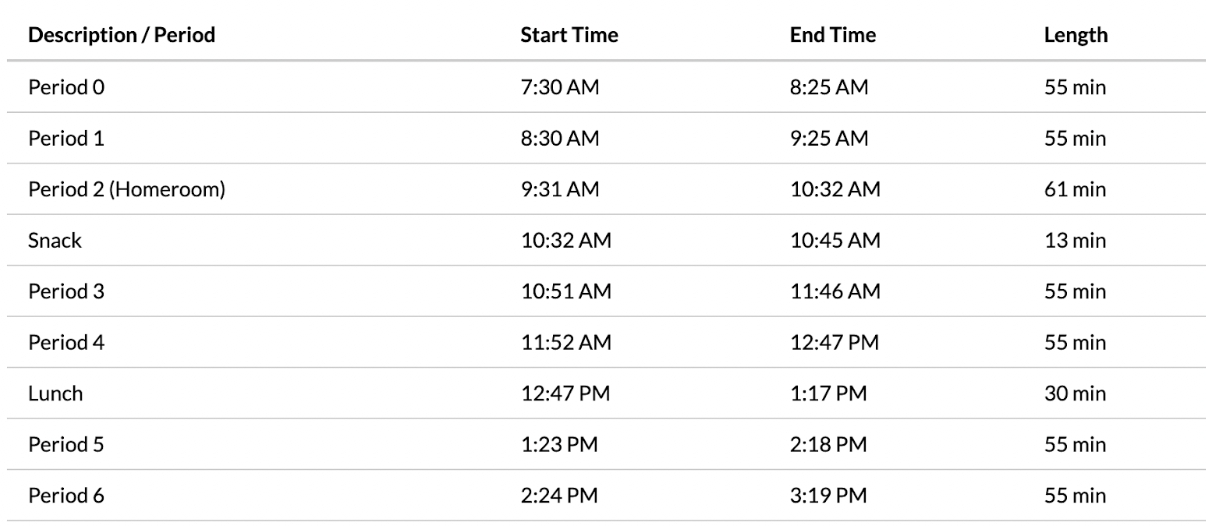 While first period starts at 8:30 a.m., students still have the option to take a zero period, which now begins at 7:30 a.m. Additionally, sixth period now ends at 3:19 p.m., rather than at 2:55 p.m.