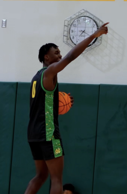Junior Preston Ezewiro points to crowd after competing in the dunk contest. Many students and staff showed up to support and watch girls and boys basketball kick off their season.