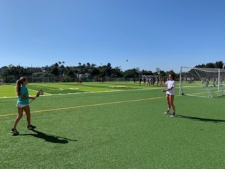 Sophmores Slavyana panayotova and Lauren Ryan, pass the lacrosse ball back in forth before practice starts. Girls lacrosse has tryouts coming up in the next week.