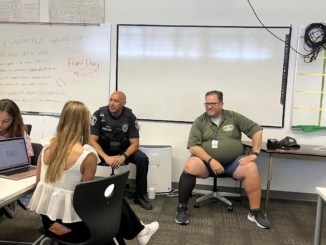 Beginning Journalism students interview Officer Torres and head of security, Ray Lee on September 15. A press conference was held to discuss the new campus security and safety regulations. Photo Courtesy: Reese Felt/Head Photo Manager
