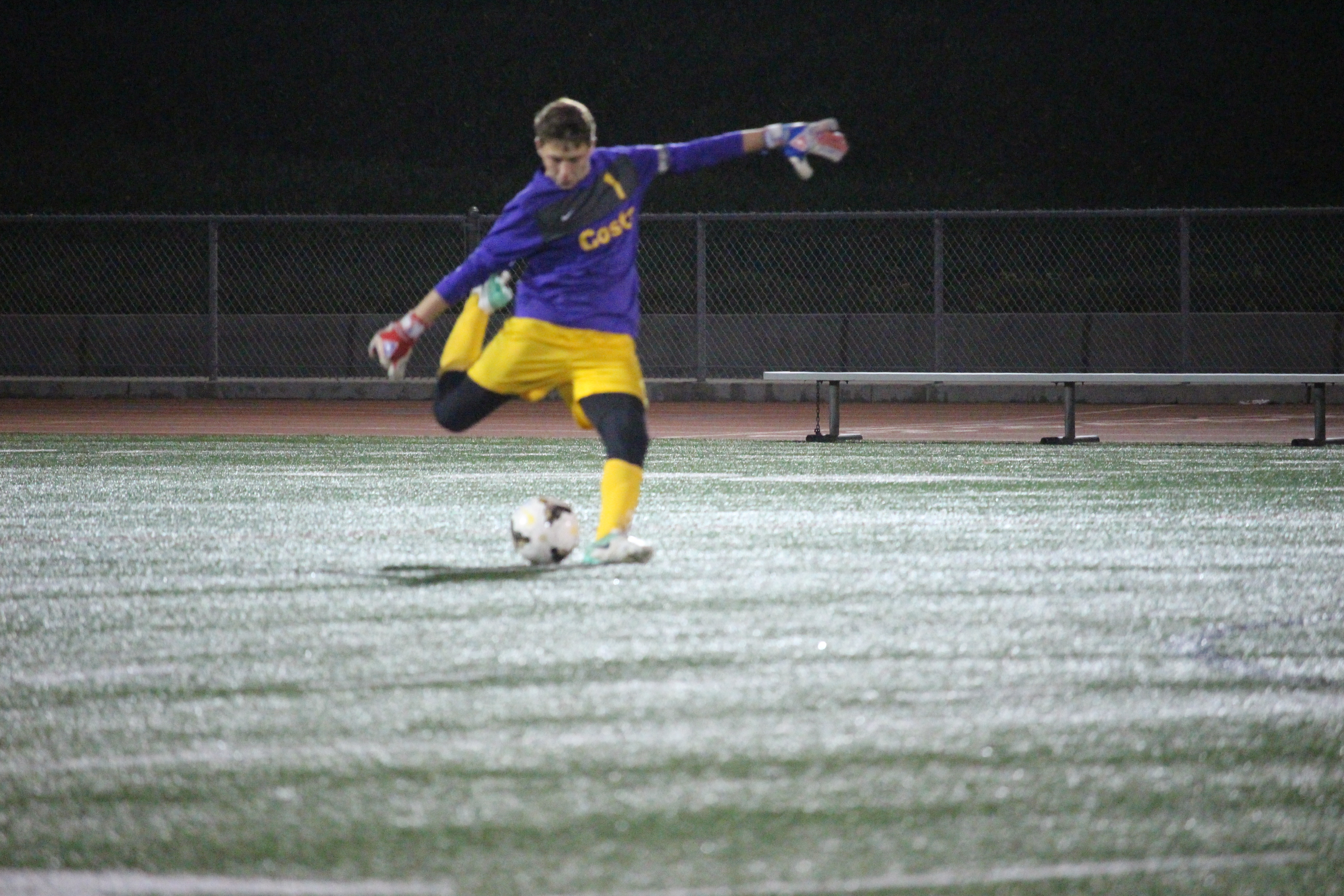 In a previous game senior goalie Andrew Fasano punts a ball down the field. The Mira Costa boys soccer team defeated Palos Verdes high school 2-1 on Jan. 30 at home.