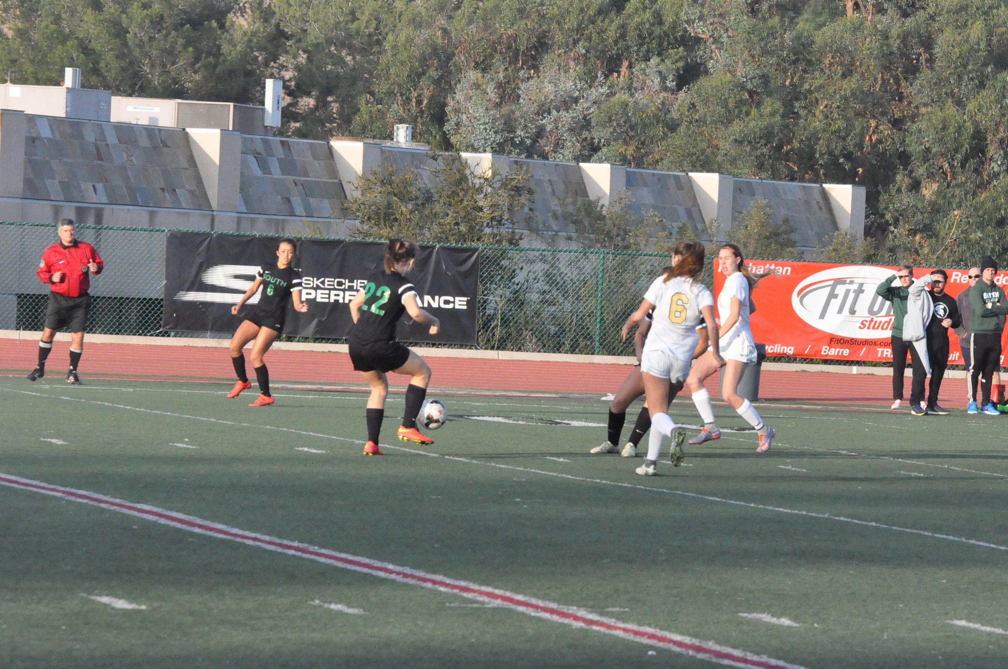 Costa players fight for a loose ball in a previous game. The Mira Costa girls varsity soccer team defeated Inglewood High School, 6-0, on Jan. 19 at Inglewood High school.
