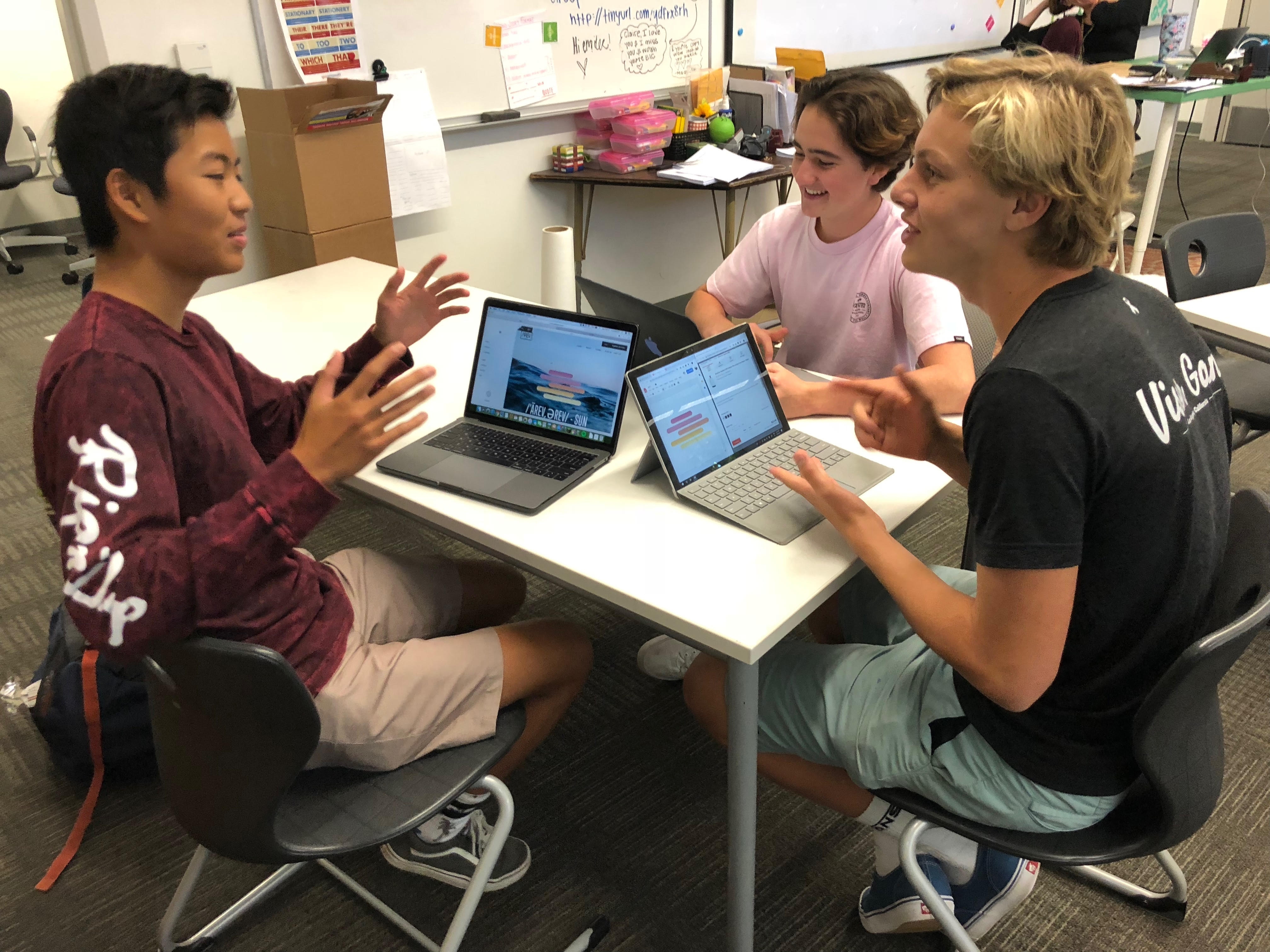For a good Cause: (left to right) Sophomores Ethan Mibu, Lucas Meyer and Max Riley collaborate while designing their website for their clothing line, AREV apparel. Their company uses its profits to donate to skin cancer research centers in Armenia. Photo by Josie Collier