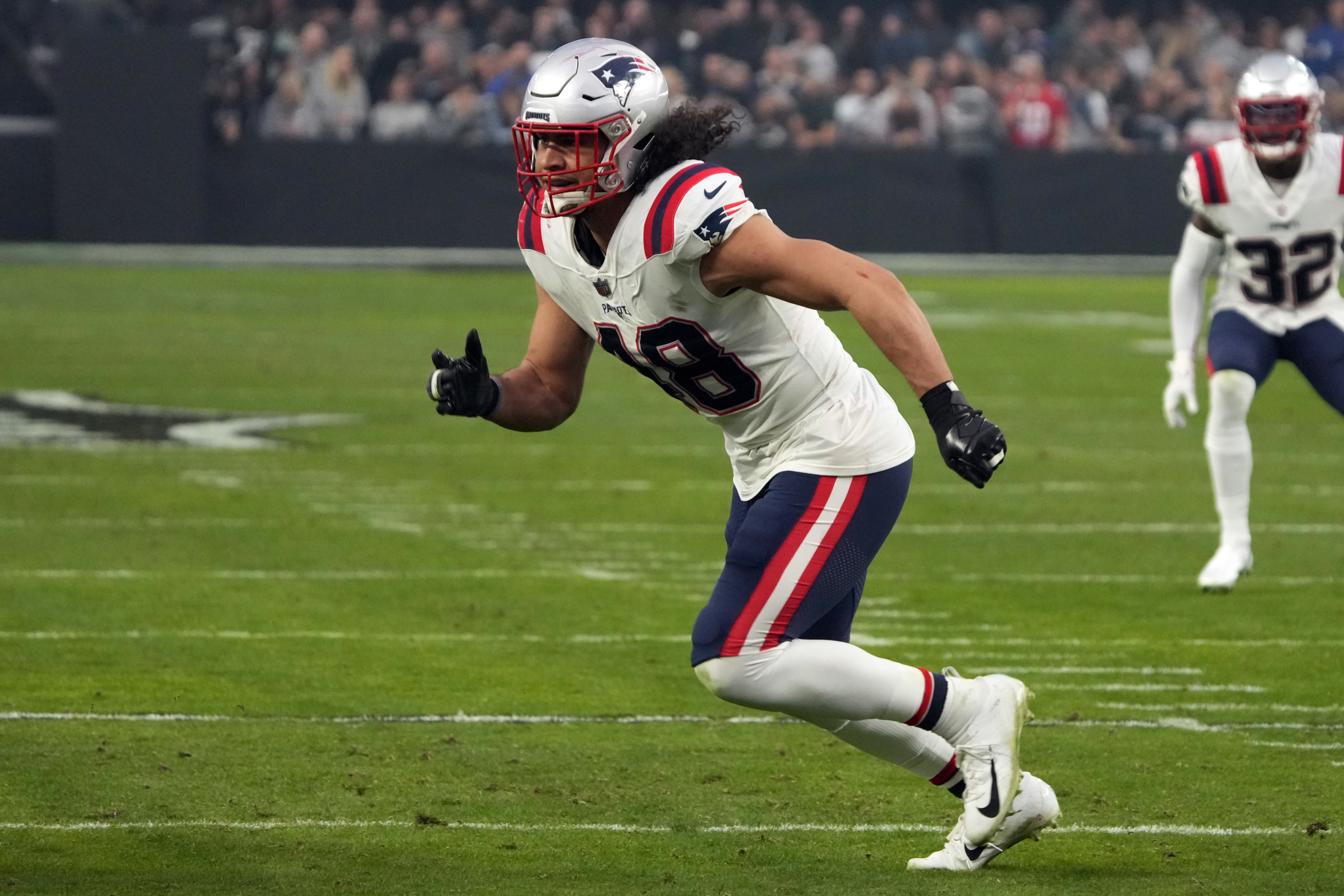 New England Patriots linebacker Jahlani Tavai (48) lines up against the Las Vegas Raiders during the first half of an NFL football game, Sunday, Dec. 18, 2022, in Las Vegas. (AP Photo/Rick Scuteri)