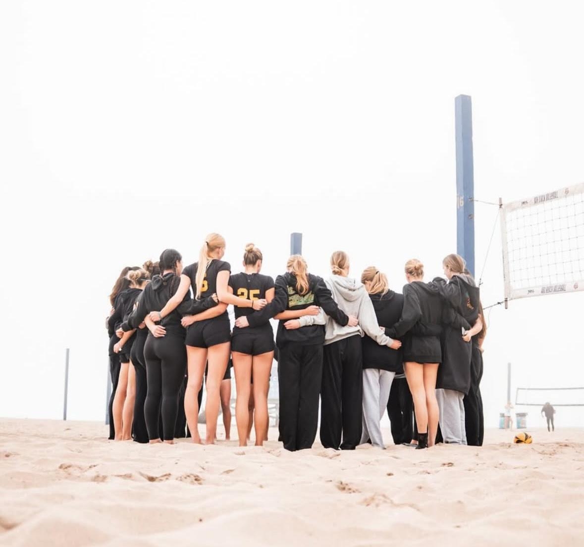 TEAM: Girls Beach Volleyball huddles up together after a big win. Costa has dominated in their games due to their great teamwork.