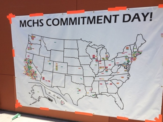 College Commitment Day is held on Apr. 28 where students come to the Mustang Mall during lunch to put their sticker with their name on it and college they will attend in the fall on the map of the United States in the state where their college is located. Students placed stickers on a variety of schools, ranging from University of California Santa Barbara to University of Michigan.