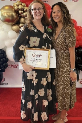 HUTCH IN ACTION: HUTCHINSON IS HONORED AT THE LA COUNTY TOTY AWARDS. SHE POSES WITH DR.HUYNH AND HER TOP 16 TEACHER AWARD. PHOTO COURTESY OF MADDIE HUTCHINSON.