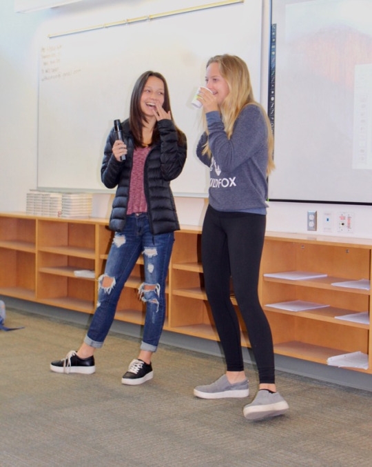 Freshman President Ambria Benson (left) and Freshman Co-President Linnea Wee (right) of Help for Hearts Club announces upcoming club events at the beginning of lunch in Mr. Chows classroom and requests for a couple volunteers to attend the first activity this week at MBMS. Help for Hearts Club was started at the beginning of this year.