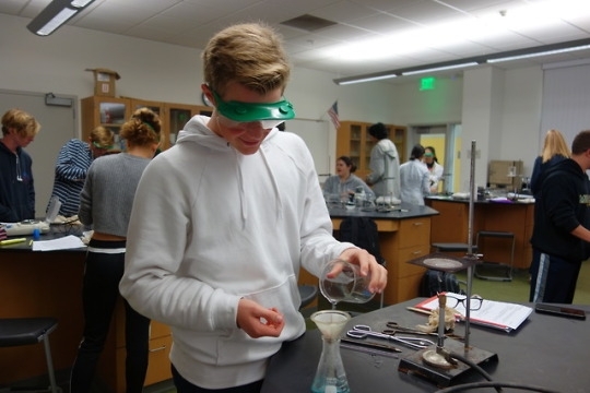 Sophomore Myles Bazoian pours sulfate pentahydrate into a beaker to filter out copper during an honors chemistry lab. Students performed a single replacement lab and created copper out of aluminum and sulfate pentahydrate.