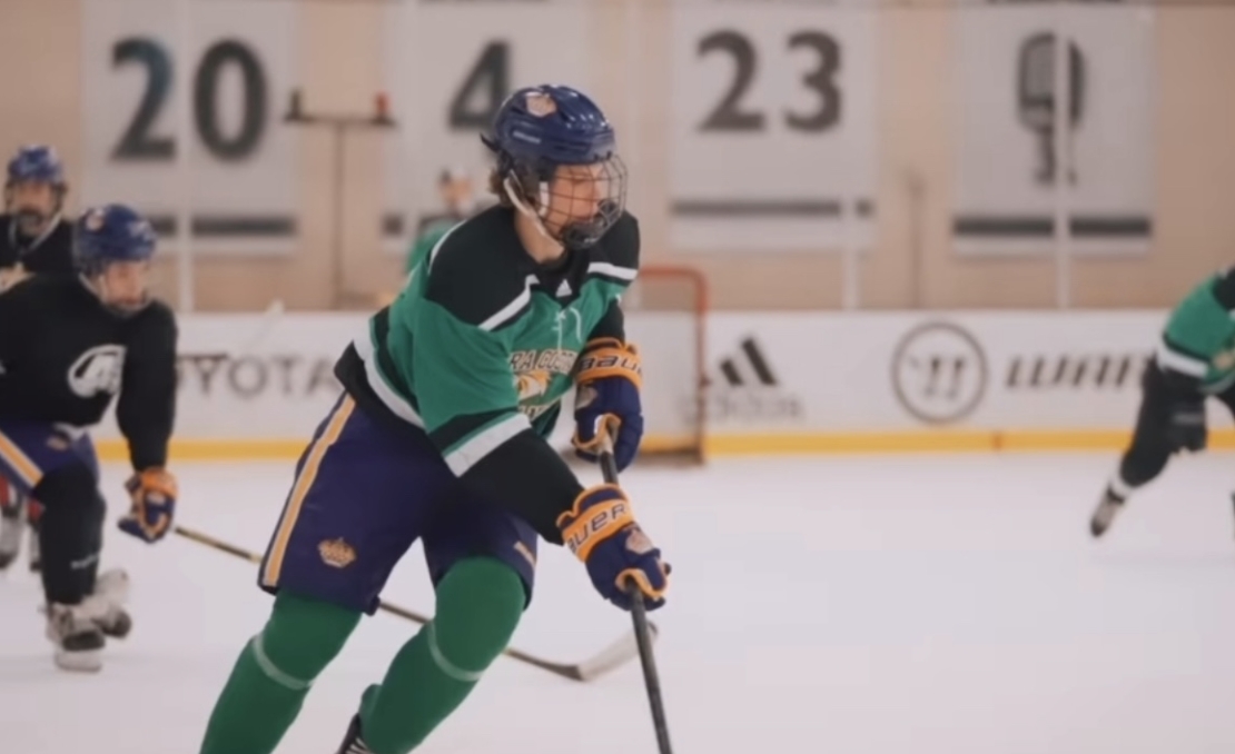 Sophomore Timofei Runtso drives up the ice towards the defending goal looking for an opportunity to score. Timofei scored two goals during the game contributing to the Mustangs victory.